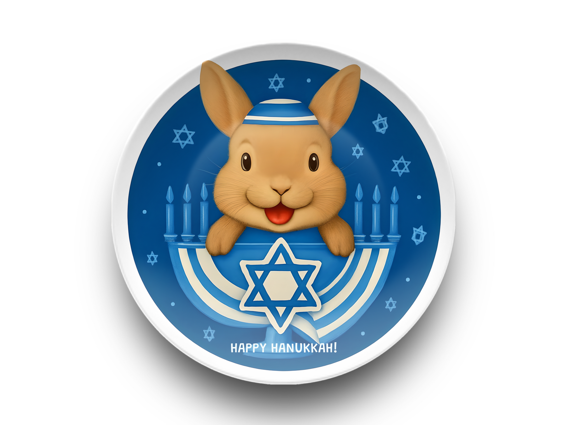 Add a touch of Hanukkah magic to snack time! This cozy, kid-friendly bowl showcases a sweet bunny nestled in a cheerful menorah design, complete with Stars of David and warm holiday vibes. Ideal for cereal, soup, and treats, it turns every bite into a festive celebration.